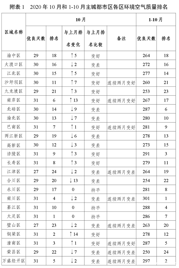 2020年10月和1-10月重庆市及各区县空气质量状况