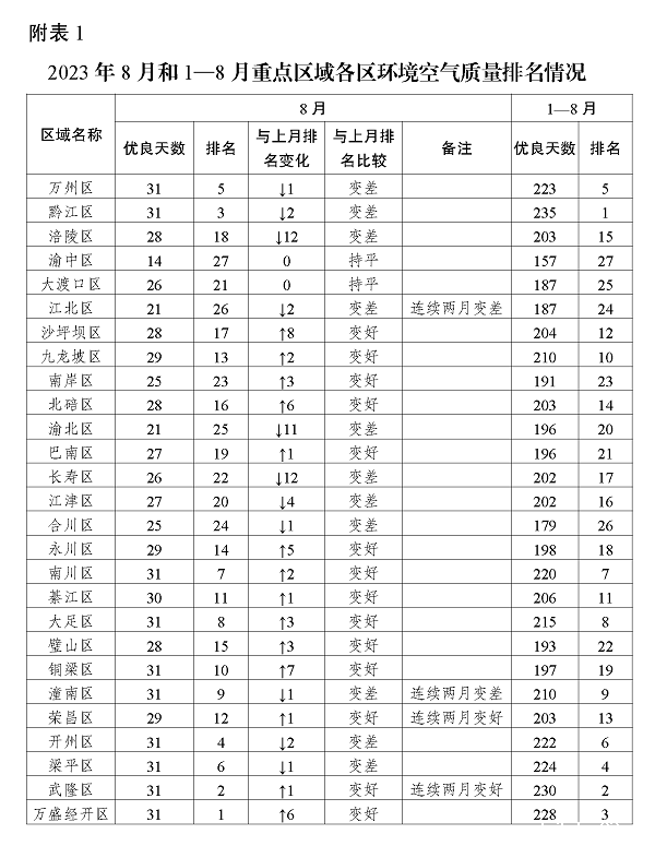 2023年8月和1-8月重庆市及各区县(自治县)环境空气质量状况