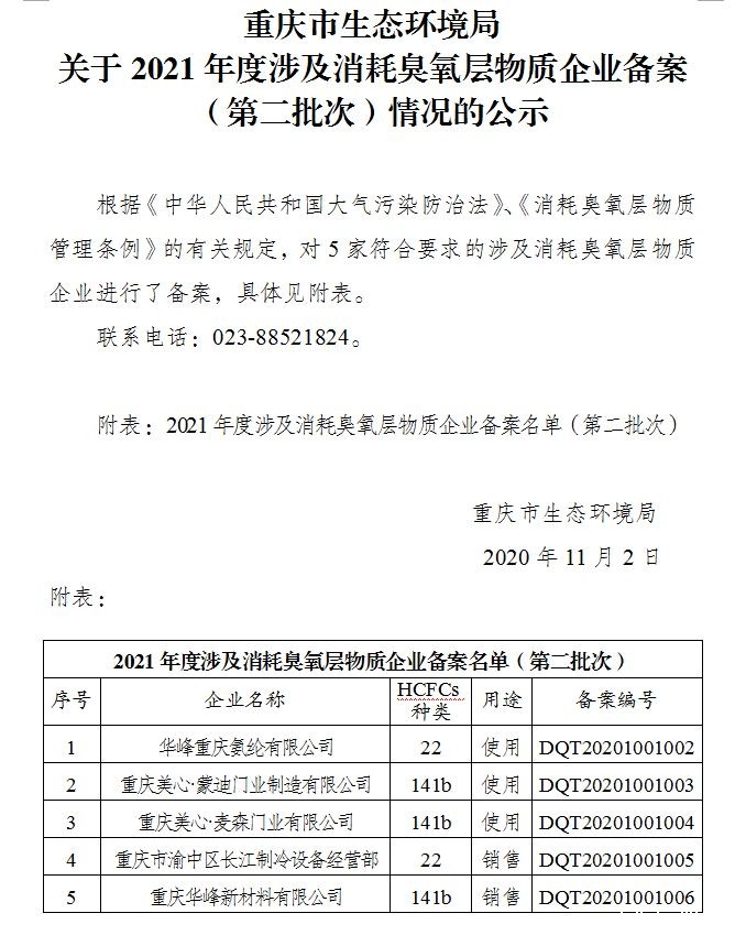 关于2021年度涉及消耗臭氧层物质企业备案 (第二批次)情况的公示