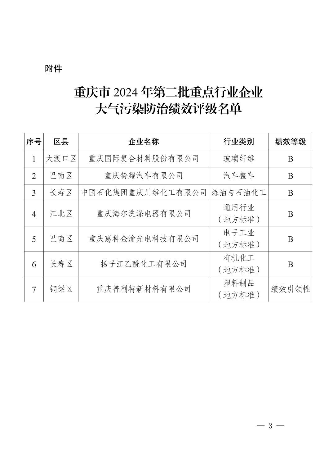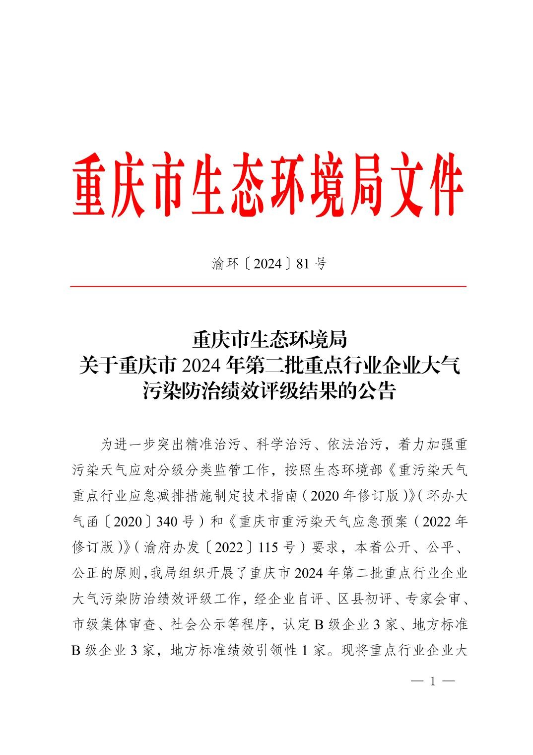 世界杯亚洲区直播平台关于重庆市2024年第二批重点行业企业大气污染防治绩效评级结果的公告