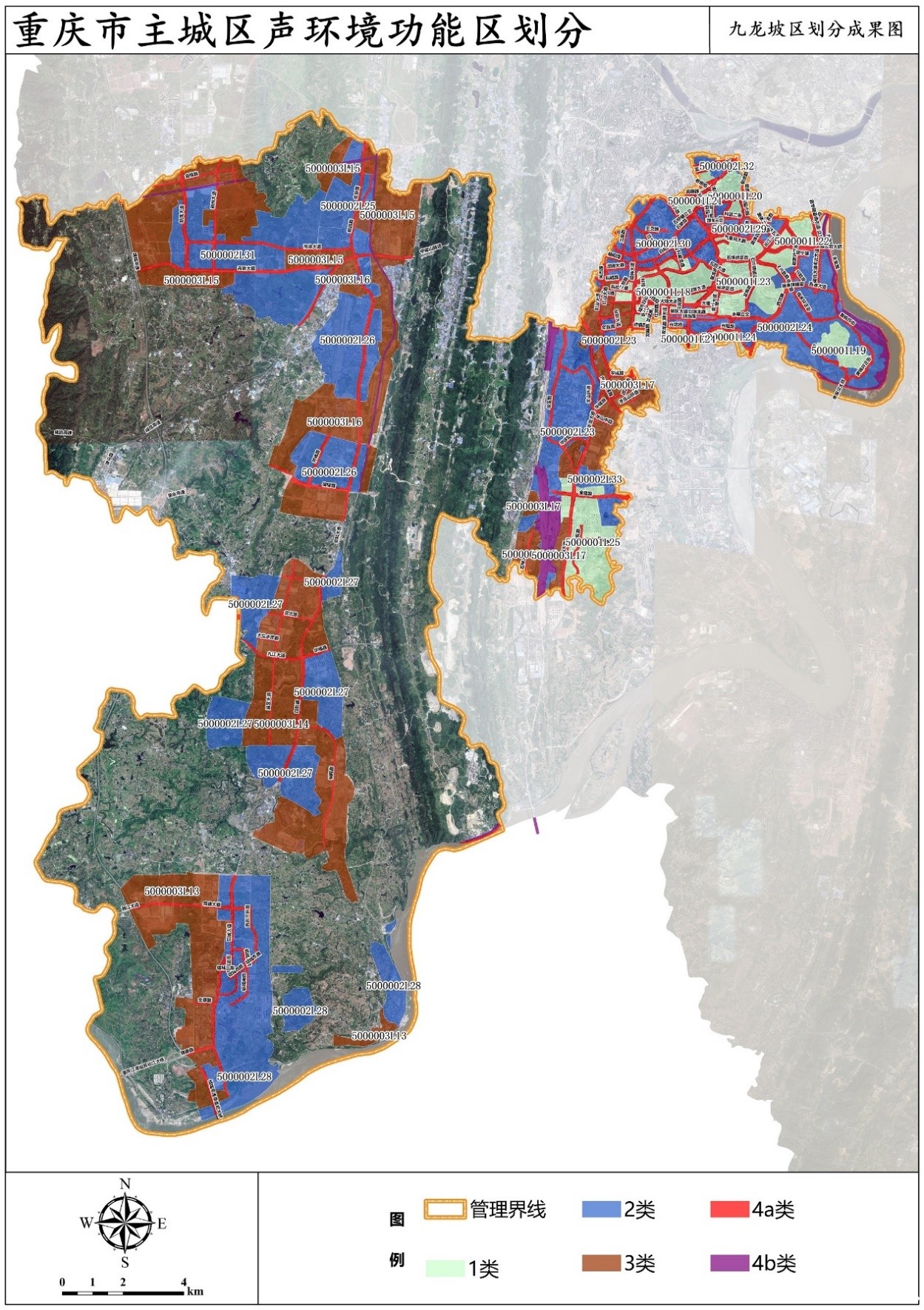 重庆市主城区声环境功能区划分总面积1462.14平方公里。其中,1类声环境功能区面积266.40平方公里,占划分总面积的18.22%;2类声环境功能区面积528.23平方公里,占划分总面积的36.13%;3类声环境功能区面积400.48平方公里,占划分总面积的27.39%;机场周围声环境功能区面积46.99平方公里,占划分总面积的3.21%;4类声环境功能区面积220.04平方公里,占划分总面积的15.05%。区域划分情况见表3,各行政区划分情况详见附表一。